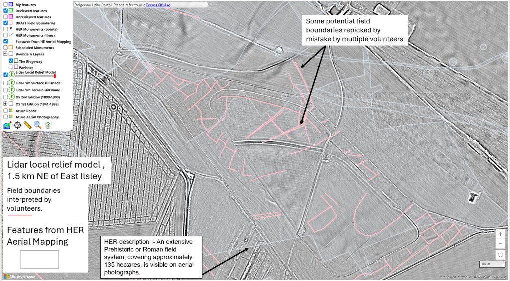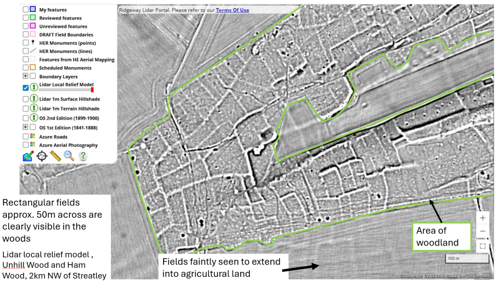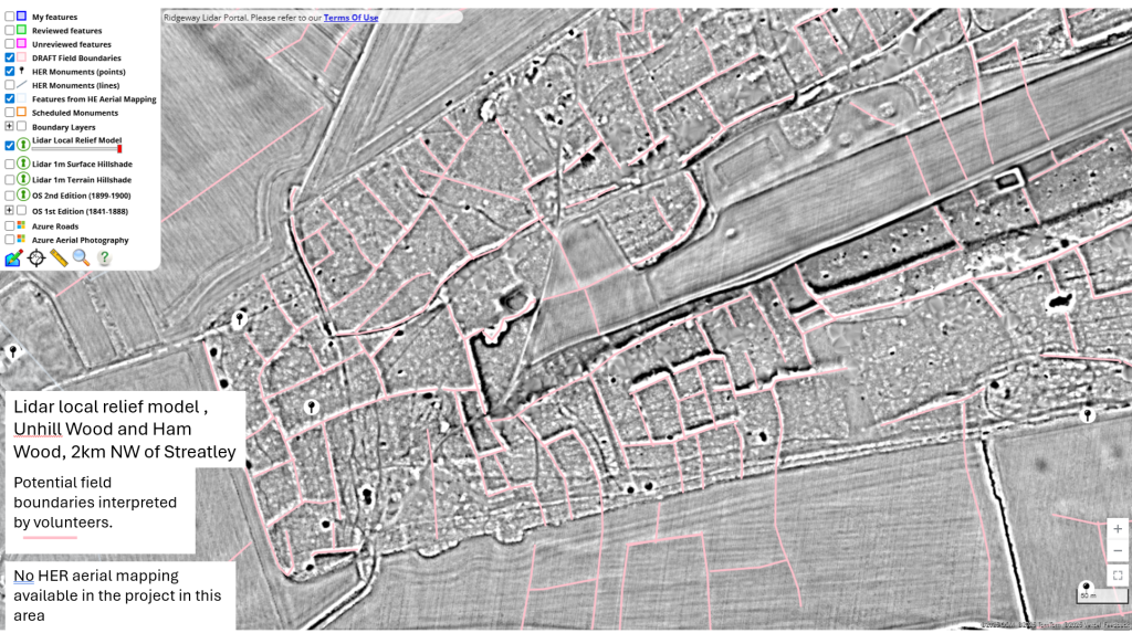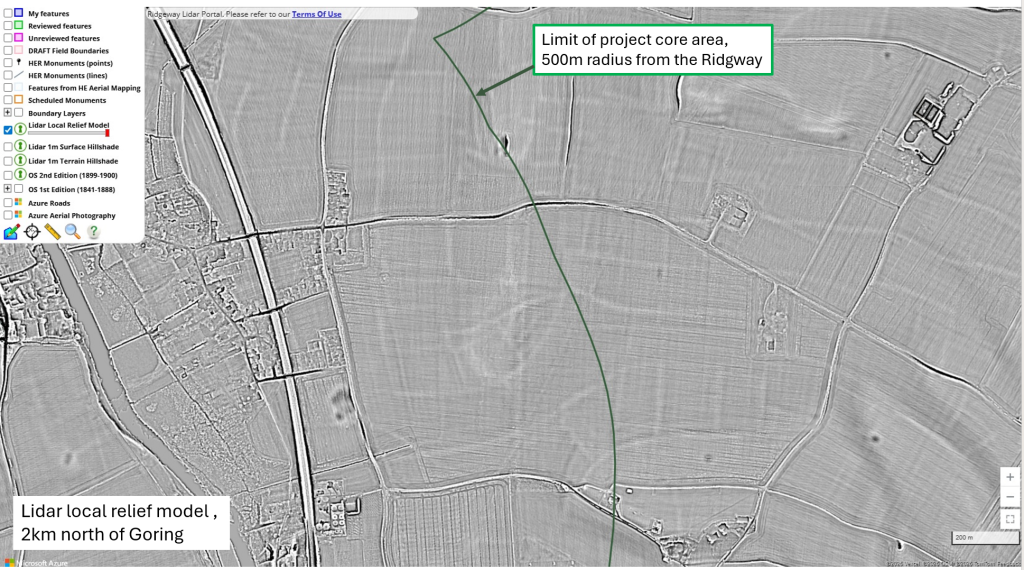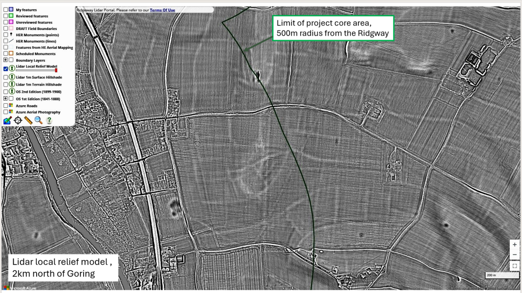 In the first year of the Ridgeway portal our incredible team of volunteers mapped 8916 relict field boundaries and 460 other features of interest from the lidar data. You can read more about it in the report from volunteer Simon below. Work is currently paused but the project team has plans for an expansion and new projects in 2026-7.