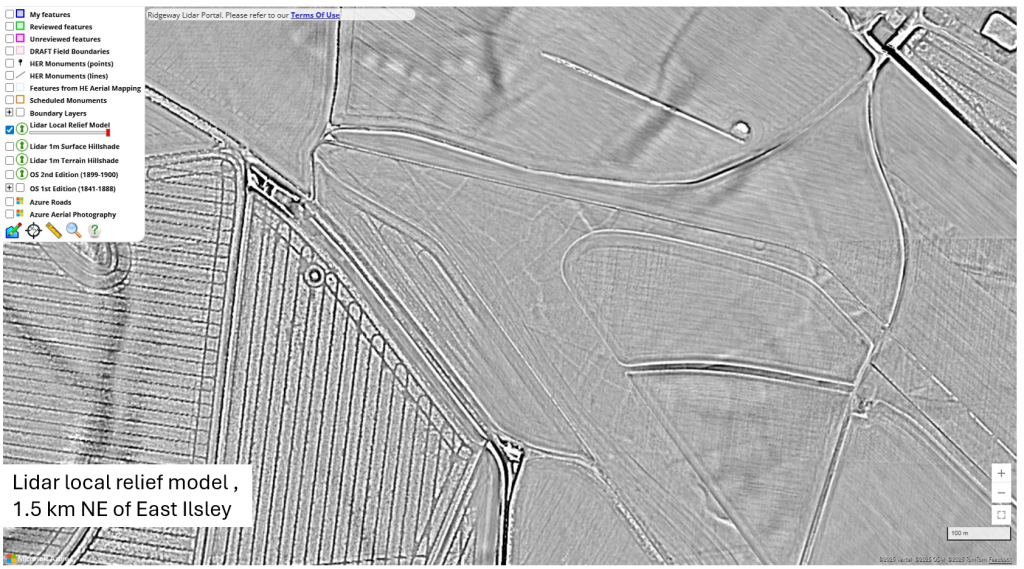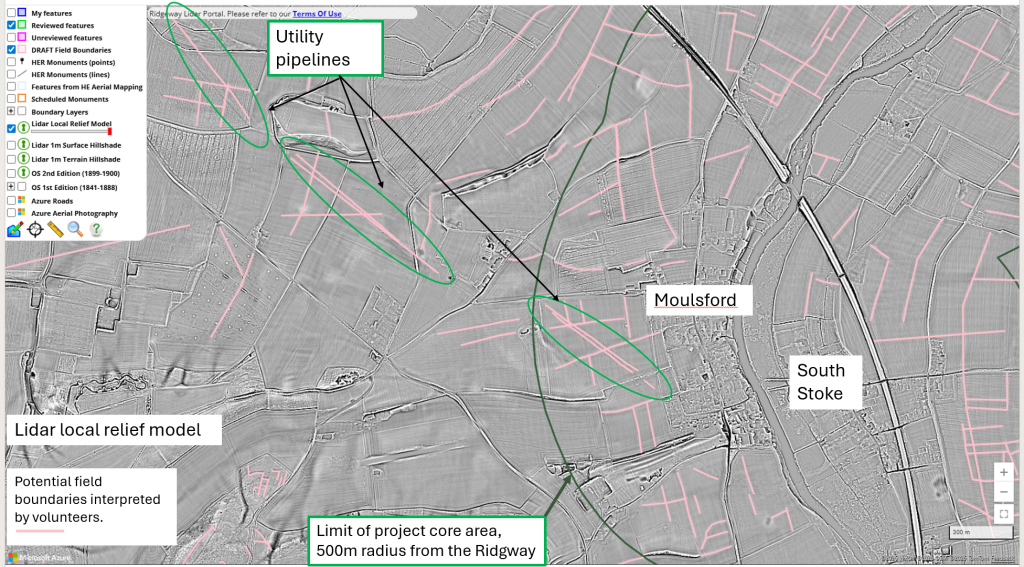 There are faint pipelines running from NW to SE right across this picture, starting at the “Ridgeway Lidar Portal” top left. One archaeological report did give a map of the pipeline that they were working on.